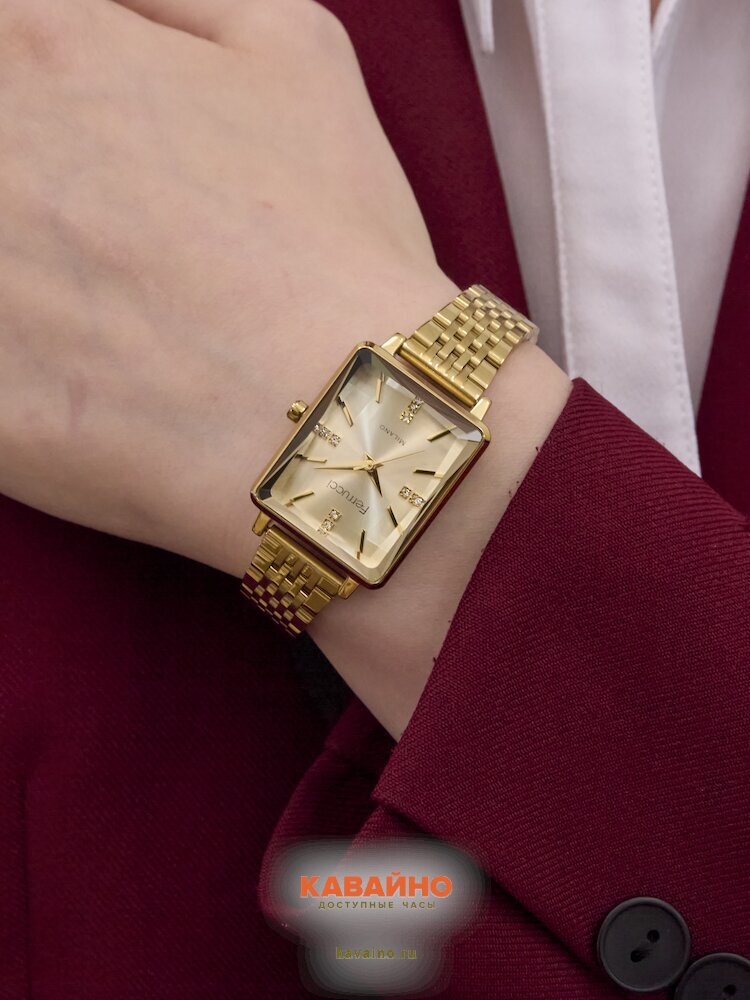 Корпус и браслет часов выполнены из нержавеющей стали в красивом золотистом цвете, что придаёт им не только великолепный внешний вид, но и высокую прочность. Золотистый циферблат с отметками и декорирован стразами, что делает часы не только функциональными, но и невероятно привлекательными. Каждый взгляд на наручные часы FERRUCCI будет приносить радость и восхищение, привлекая внимание окружающих.