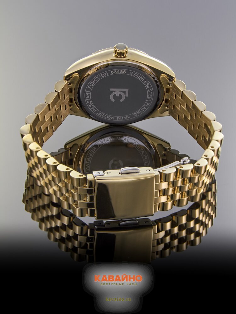 Браслет выполнен из нержавеющей стали и также окрашен в золотистый цвет, создавая гармоничный ансамбль с корпусом. Минеральное стекло защищает циферблат, который, как и весь дизайн часов, выполнен в золоте. Комбинированная индикация времени с действующими дополнительными циферблатами добавляет функциональности и оригинальности, позволяя следить за временем с легкостью и комфортом.