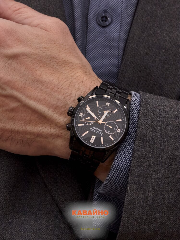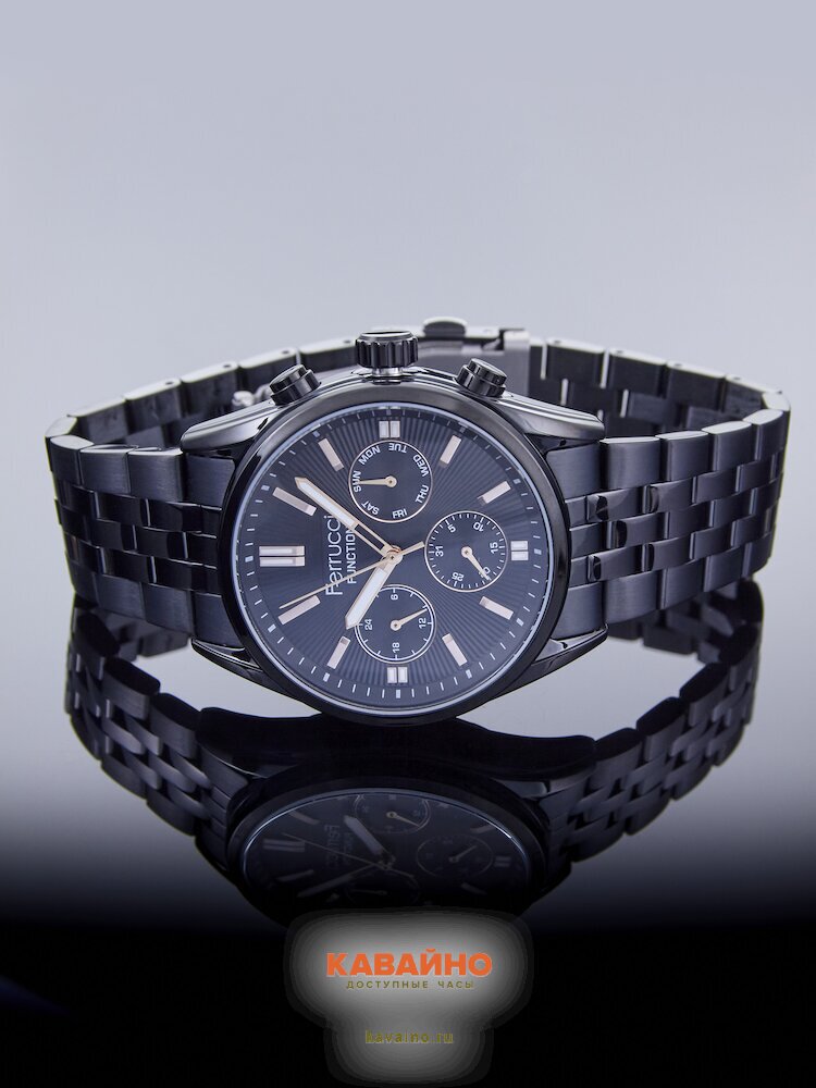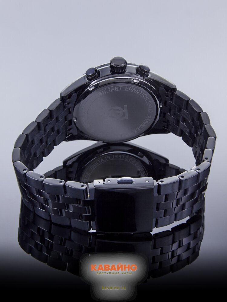 Циферблат также черного цвета, что подчеркивает его лаконичную и сдержанную эстетику. Часы оснащены дополнительными действующими циферблатами и отметками, что делает их использование удобным и практичным. Встроенный календарь добавляет функциональности, позволяя отслеживать важные даты и события.