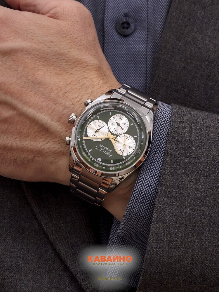 С их помощью вы сможете не только поддерживать стильный образ, но и получать точную информацию о времени. Аналоговый способ отображения времени и комбинированная индикация гарантируют, что каждая минута будет четко видна на эффектном зеленом циферблате. Хромированный корпус из прочного сплава добавляет часам современный вид и надежность, а нержавеющая сталь ремешка в серебристом цвете обеспечивает удобство и комфорт в носке.