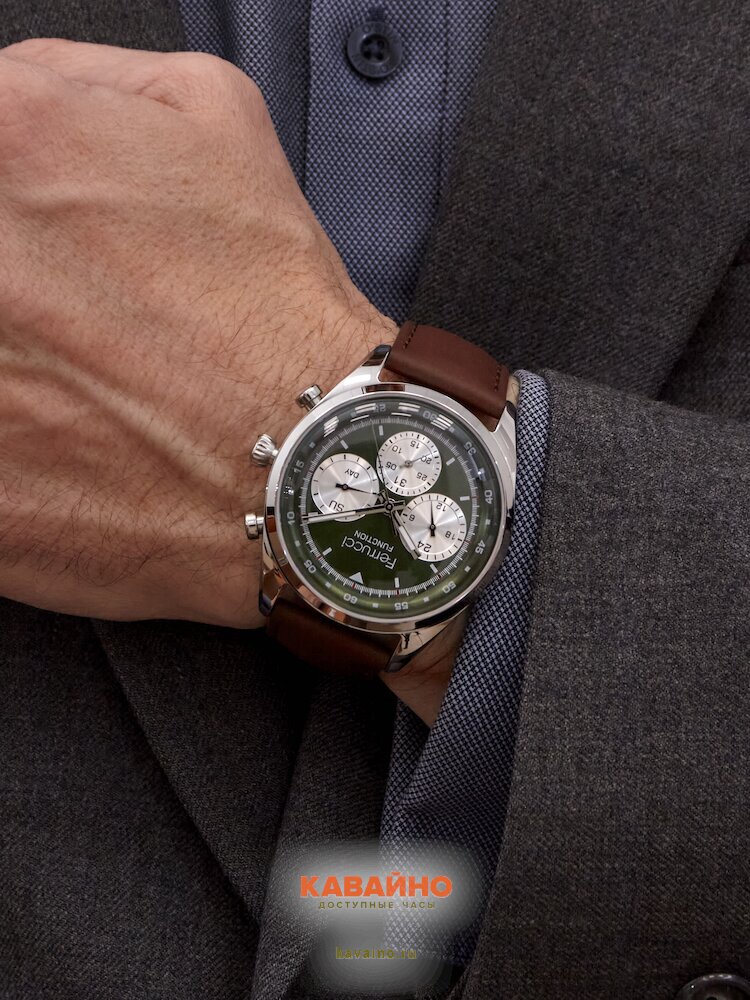 Циферблат в насыщенном зеленом цвете с арабскими цифрами привлекает внимание и делает время легко читаемым. Дополнительные действующие циферблаты позволят вам следить за важной информацией в любое время. Календарь, встроенный в часы, станет незаменимым помощником в планировании ваших дел.