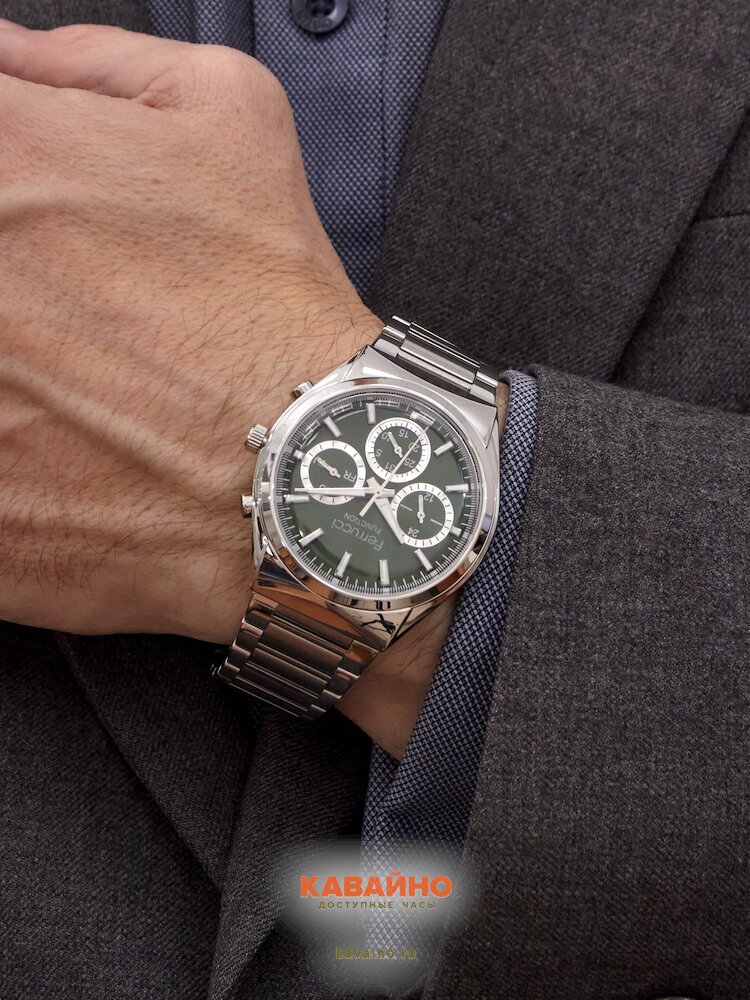 Часовой циферблат изящного зеленого цвета отличается минималистичным дизайном и удобной индикацией времени с отметками. Дополнительные действующие циферблаты не только добавляют функциональности, но и подчеркивают стильный вид. Часы работают от надежной батарейки, обеспечивающей бесперебойную работу на протяжении долгого времени.