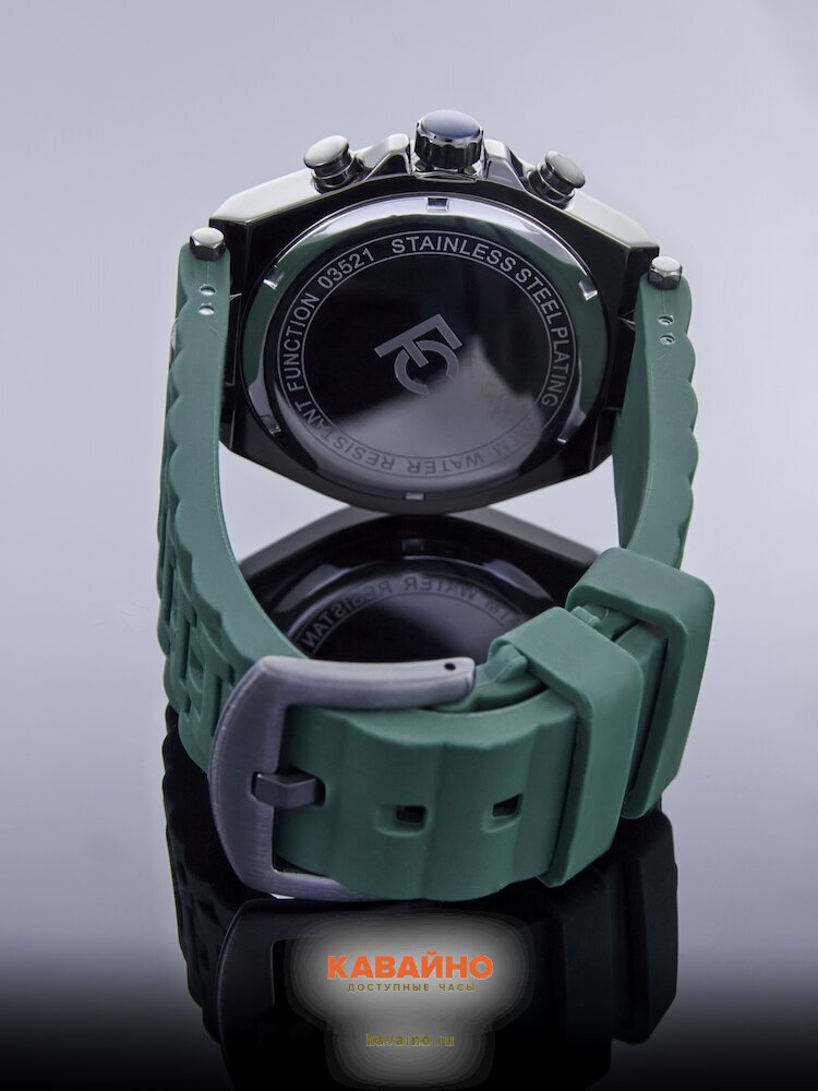 Силиконовый ремешок зеленого цвета не только комфортен в носке, но и отлично сочетается с корпусом, создавая гармоничный образ. Длина ремешка составляет 200 мм, а ширина 22 мм, что идеально подходит для большинства запястий. Удобная застежка гарантирует надежную фиксацию на руке.