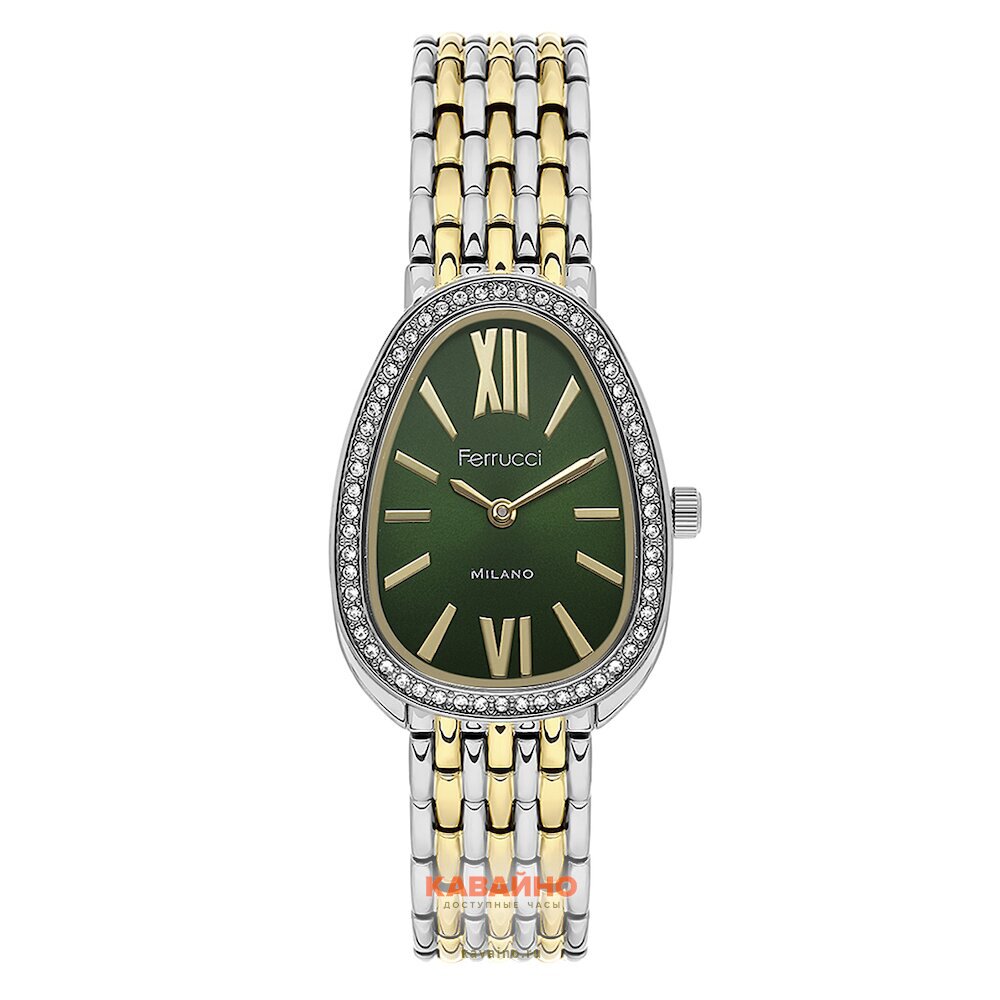 Часы FERRUCCI 3578-04 оснащены аналоговым способом отображения времени и имеют овальную форму корпуса цвета хром, что придаёт им современный и стильный вид. Зеленый циферблат с комбинированной индикацией подчеркивает уникальность модели, а переливающиеся стразы добавляют нотку роскоши и изящества.