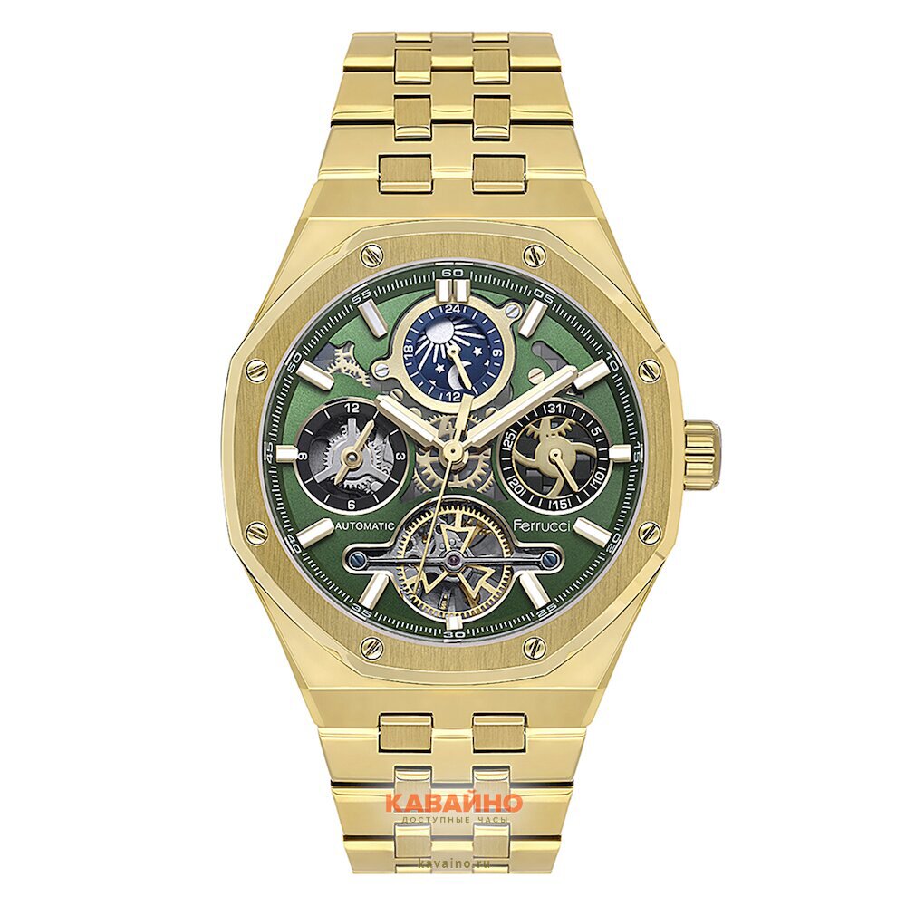 Часы FERRUCCI 3571-02 имеют аналоговый способ отображения времени, оформленный в модном восьмиугольном корпусе золотистого цвета, выполненном из прочного сплава (Alloy). Уникальный зеленый циферблат с отметками и действующими дополнительными циферблатами не только выглядит эффектно, но и обеспечивает максимальную читаемость. Удобный нержавеющий стальной браслет также в золотистом оттенке создает гармоничный комплект, дополненный надежной застежкой, что гарантирует ваши комфорт во время носки.