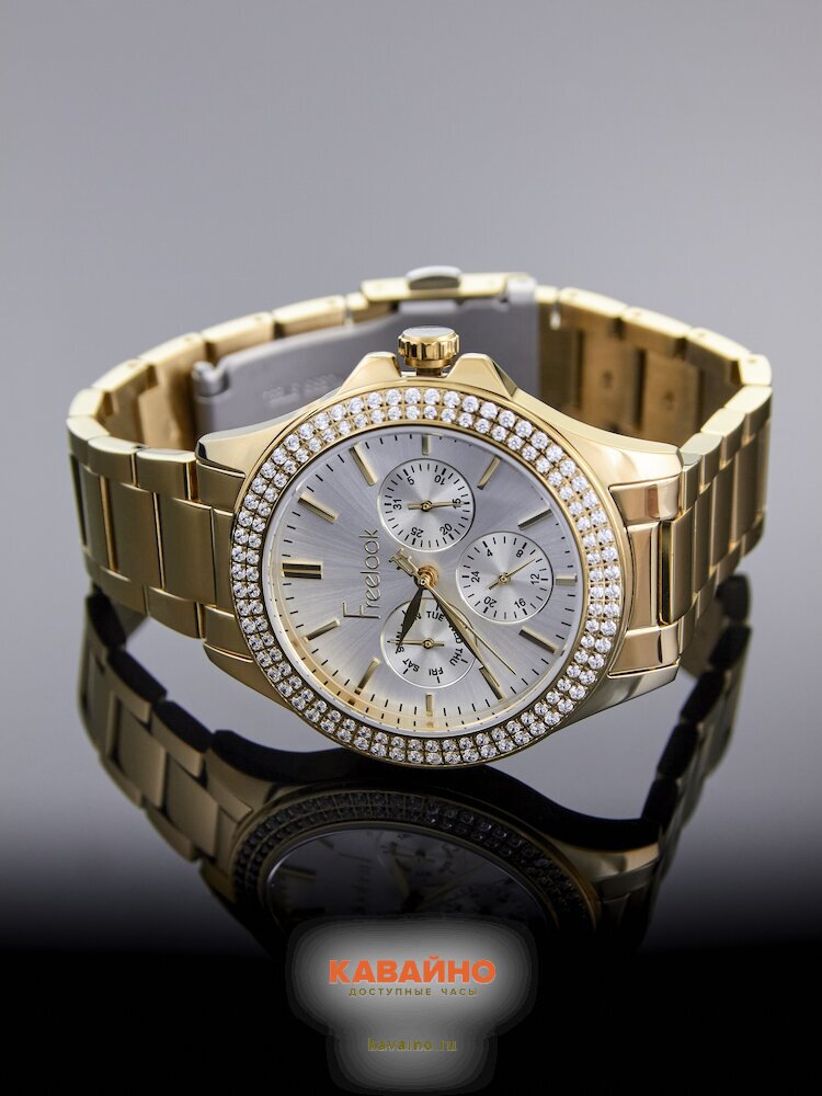 С их круглой формой и золотистым корпусом, выполненным из нержавеющей стали, часы смотрятся невероятно привлекательно. Серебристый циферблат, украшенный стразы, придаёт изделию шикарный вид, который станет ярким акцентом любого образа. Дополнительные действующие циферблаты и отметки позволяют легко отслеживать время, оставаясь при этом в центре внимания.