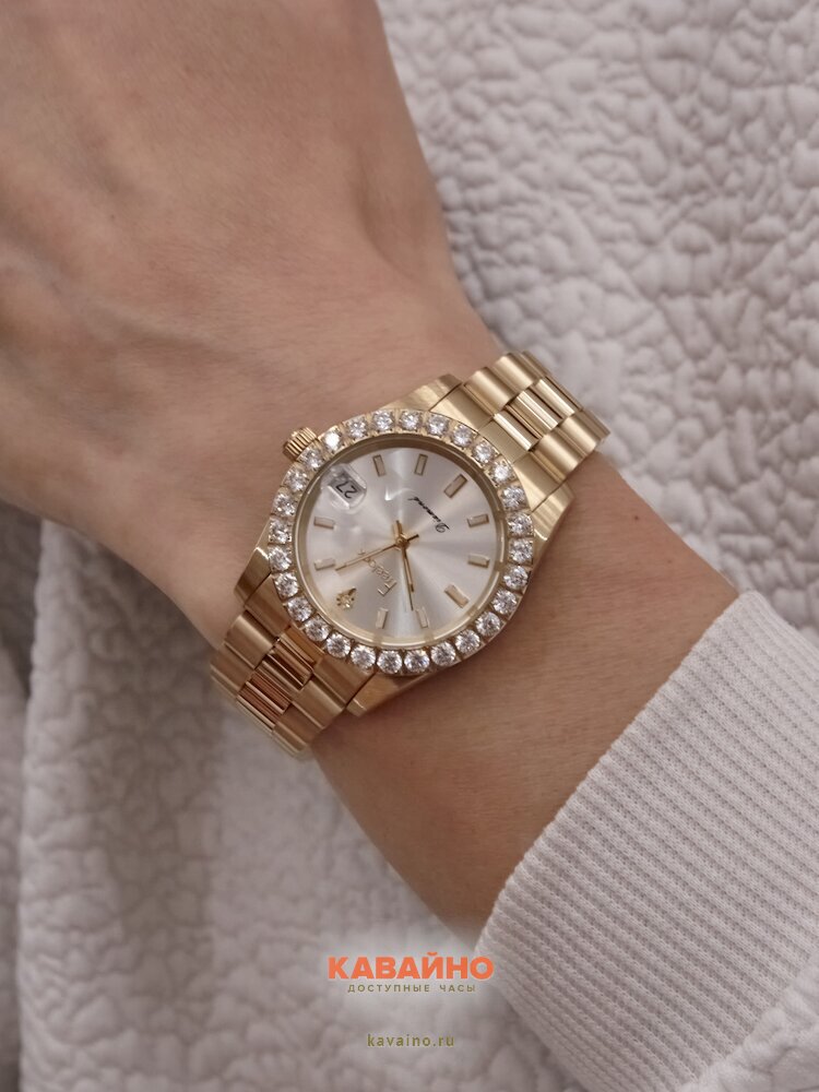 Корпус часов выполнен из нержавеющей стали и представлен в привлекательном золотистом цвете, что придает изделию нотки роскоши. Серебристый циферблат с яркими стразы создает впечатление утонченности и шарма, идеально подчеркивая ваш индивидуальный стиль. Ширина ремешка в 17 мм и длина 170 мм обеспечивают комфортную посадку на запястье, а также добавляют дополнительную изящность вашему образу.