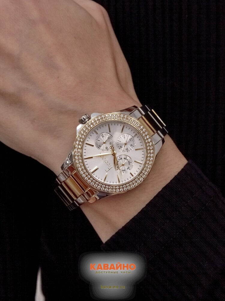 Циферблат с серебристым оттенком прекрасно сочетается с индикацией отметками и яркими стразы, которые делают часы по-настоящему уникальными и притягательными. Дополнительные действующие циферблаты добавляют функциональности и удобства в использовании. Кроме того, в этих часах предусмотрен календарь, что сделает вашу повседневную жизнь еще комфортнее.