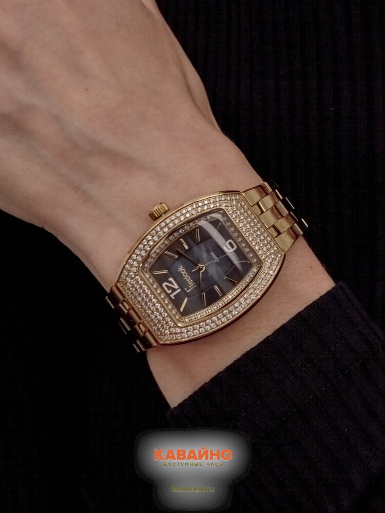 Часы имеют бочкообразную форму корпуса, выполненного из нержавеющей стали с золотистым покрытием, что придает им утонченный и шикарный вид. Темно-сер Convex циферблата подчеркнут стильный комбинированный тип индикации, а детализированные стразы добавляют изюминку и блеск. Способ отображения времени – аналоговый, что позволяет легко считывать время с любой дистанции.
