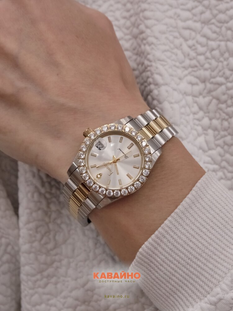 **Аналоговый способ отображения времени** гарантирует легкость восприятия, а стильный **круглый циферблат** серебристого цвета с изысканными **страйзами** придаёт вашему образу изысканности и шарма. Корпус из **нержавеющей стали** с эффектом хрома подчеркивает вашу индивидуальность и делает часы идеальным дополнением к любому стилю.