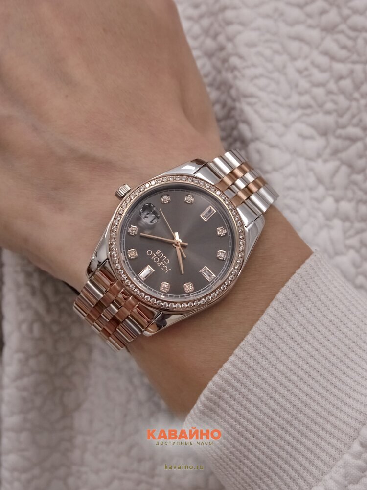 Корпус из нержавеющей стали с хромированным покрытием не только выглядит привлекательно, но и обеспечивает долговечность изделия. Темно-серый циферблат украшен изысканными стразы, которые придают часам дополнительный блеск и шарм. Круглая форма и классическая стильная эстетика делают их универсальным аксессуаром для любого повода.