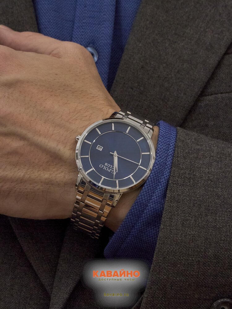 Корпус часов выполнен из нержавеющей стали в элегантном хромированном цвете, что гарантирует не только стильный внешний вид, но и долговечность изделия. Круглая форма добавляет часам строгости и солидности, а синий циферблат с отметками делает их легкими для восприятия, даже в самых ярких условиях.