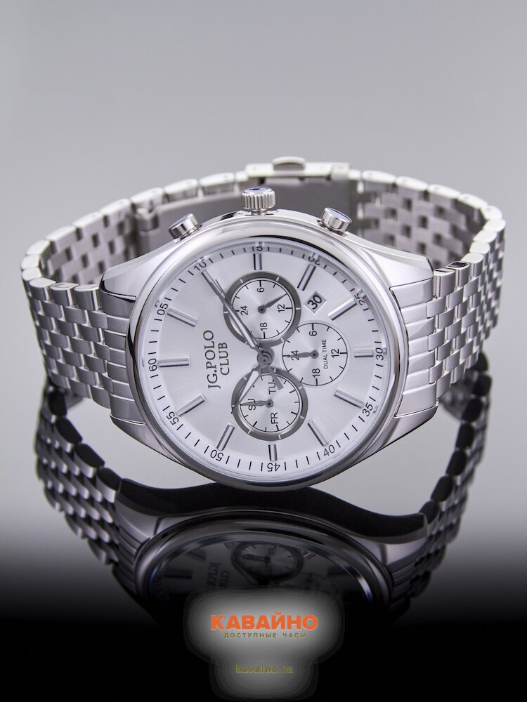 Часы JG.POLO CLUB обладают множеством функциональных возможностей: этот стильный аксессуар оснащен календарем и вторым часовым поясом, что делает их особенно удобными для ???????ателей. Кварцевый механизм с батарейным источником энергии гарантирует высокую точность работы.
