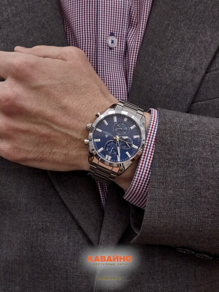 Корпус часов выполнен из прочного сплава (Alloy) с элегантной хромированной отделкой, а круглая форма создает эстетически приятный вид. Циферблат с глубоким синим цветом и отчетливыми отметками гарантирует легкость считывания времени в любой ситуации. Дополнительные циферблаты подчеркивают функциональность и делают часы еще более практичными.