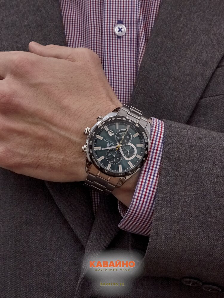 Круглая хромированная форма корпуса гармонично сочетается с элегантным серебристым браслетом из нержавеющей стали, обладающим прочностью и долговечностью. Зеленый циферблат с отметками и действующими дополнительными циферблатами придает часам оригинальность и легкость в прочтении времени. Благодаря подсветке вы сможете легко ориентироваться во времени даже в условиях недостаточной освещенности.