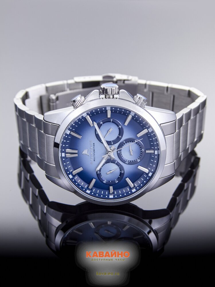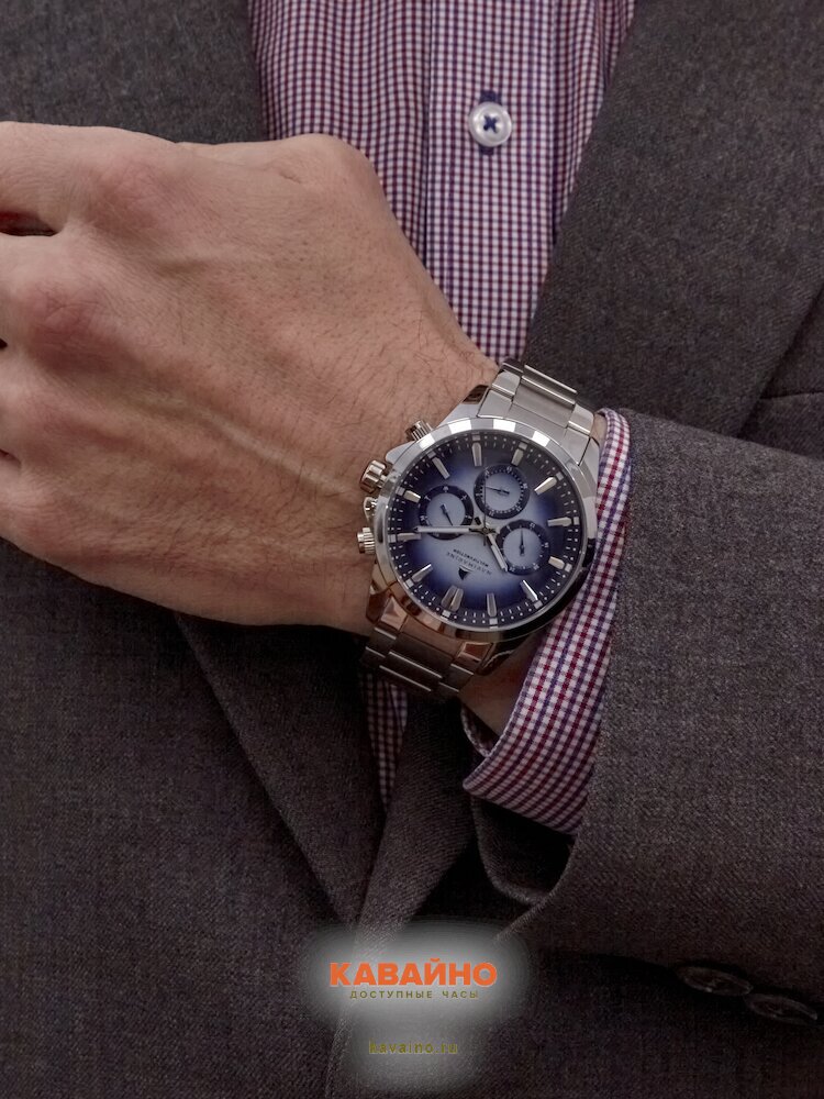 Способ отображения времени — аналоговый, что придает часам традиционный шарм. Яркий синий циферблат, обрамленный хромированным корпусом из легкого сплава, притягивает взгляд и отлично смотрится в любом окружении. Дополнительные циферблаты добавляют функциональности, а отметки на главной шкале позволяют легко считывать время.