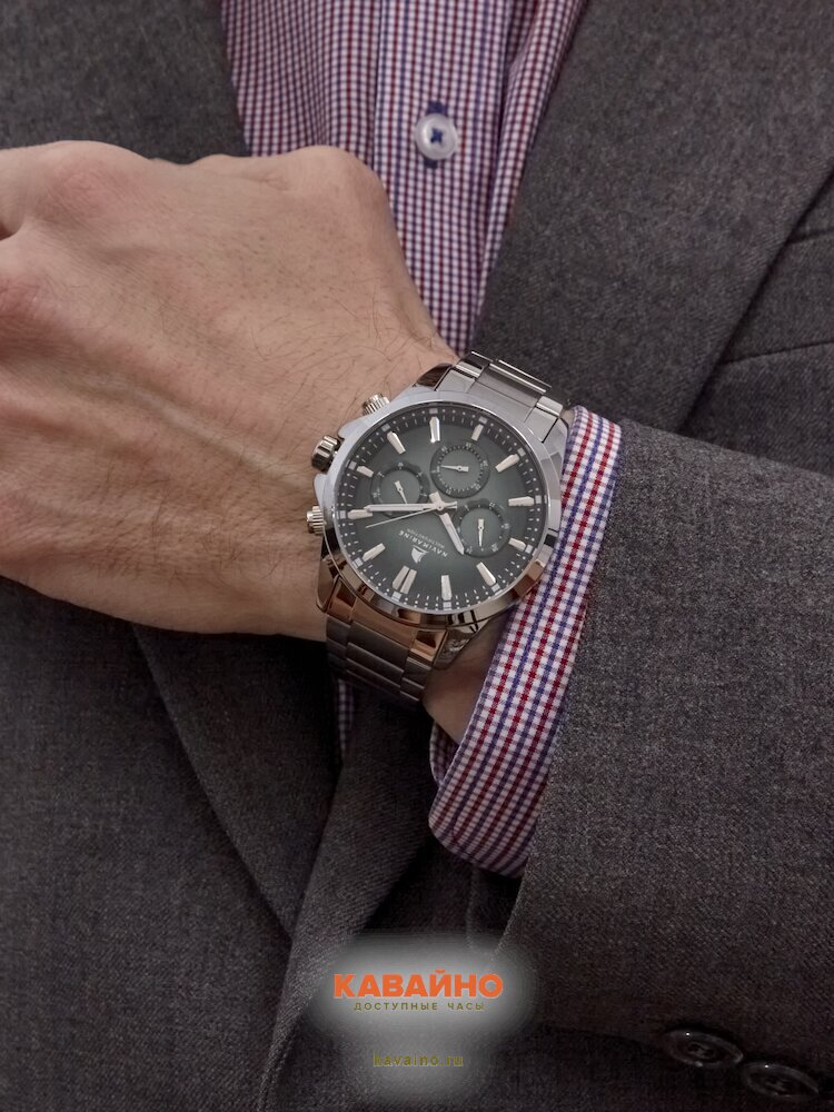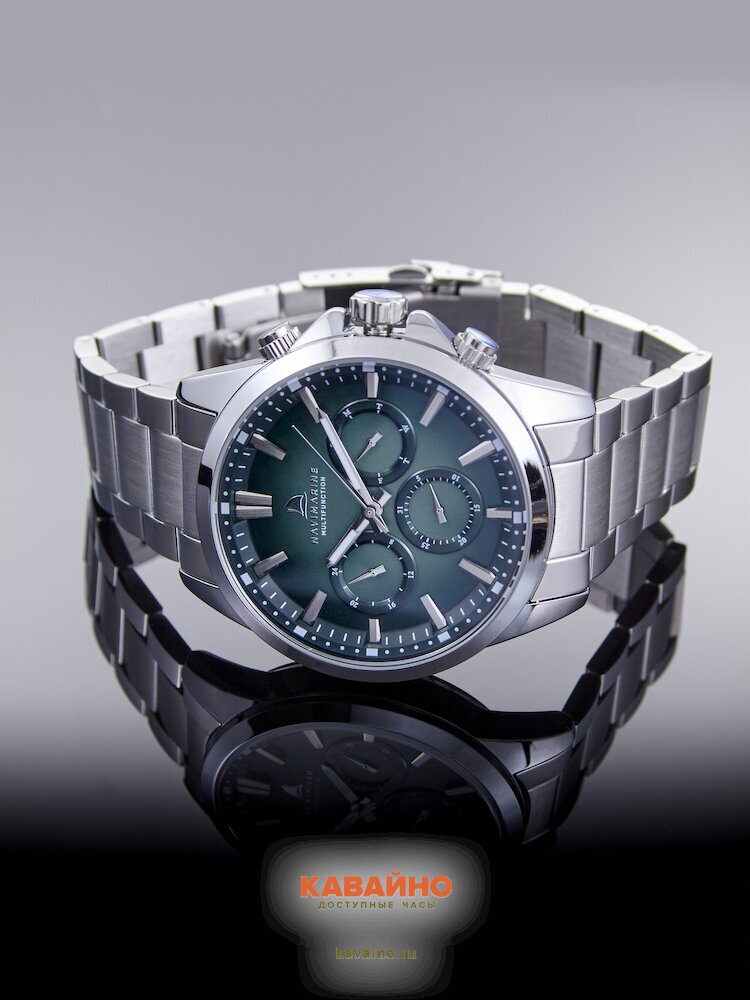 Циферблат зеленого цвета поражает своей оригинальностью и контрастом с отметками, обеспечивая легкость считывания времени. Аналоговый способ отображения времени добавляет часовому механизму элегантности и стиля. Дополнительные действующие циферблаты и встроенный календарь делают эти часы не только стильными, но и функциональными.