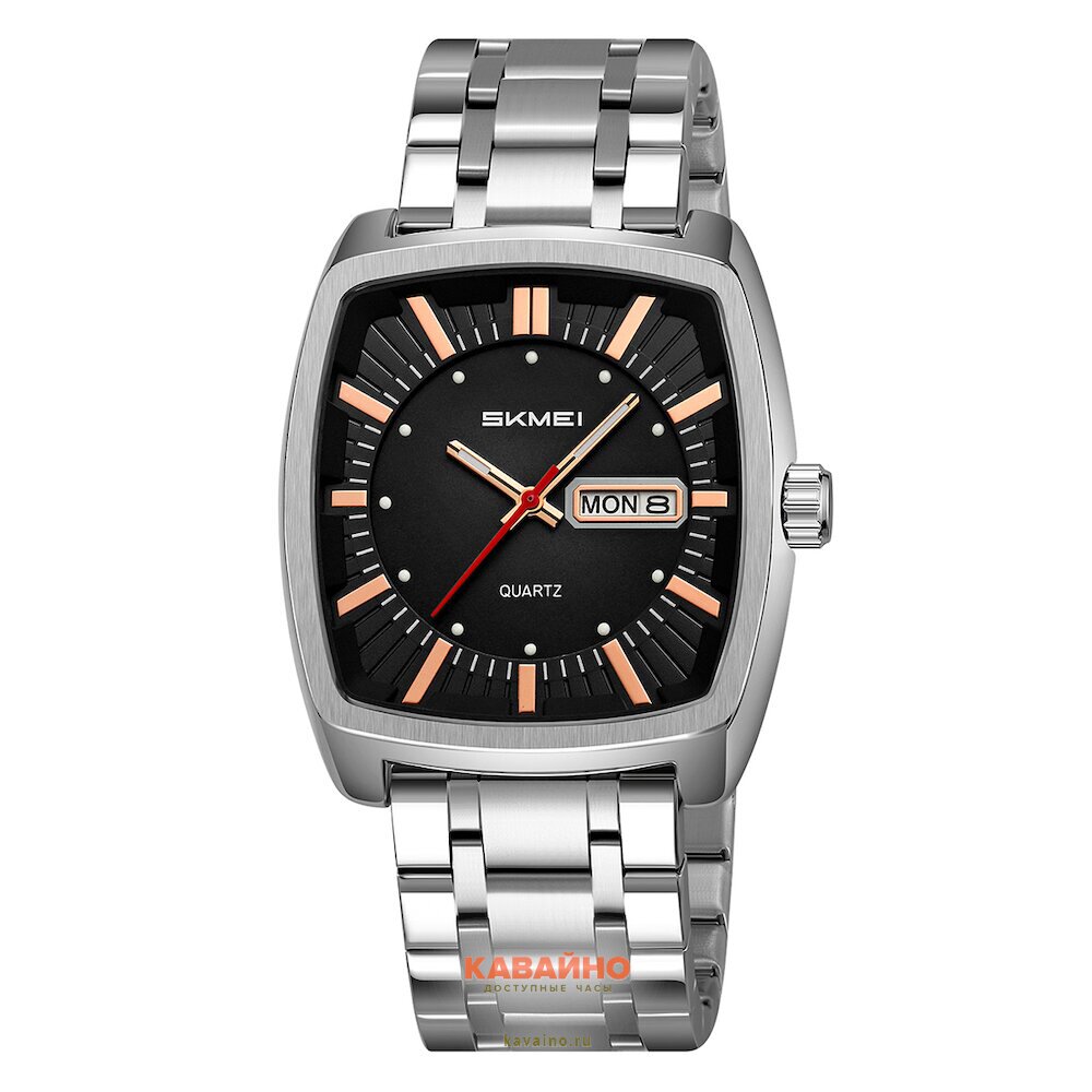 Часы имеют прямоугольную форму и выполнены в классическом черном цвете, что придает им универсальность и позволяет легко сочетать с различными стилями одежды. Черный циферблат контрастирует с серебристым браслетом из нержавеющей стали, обеспечивая стильный вид и долговечность. К тому же, материал корпуса из сплава (Alloy) делает часы легкими, а минеральное стекло защищает от царапин и повреждений.