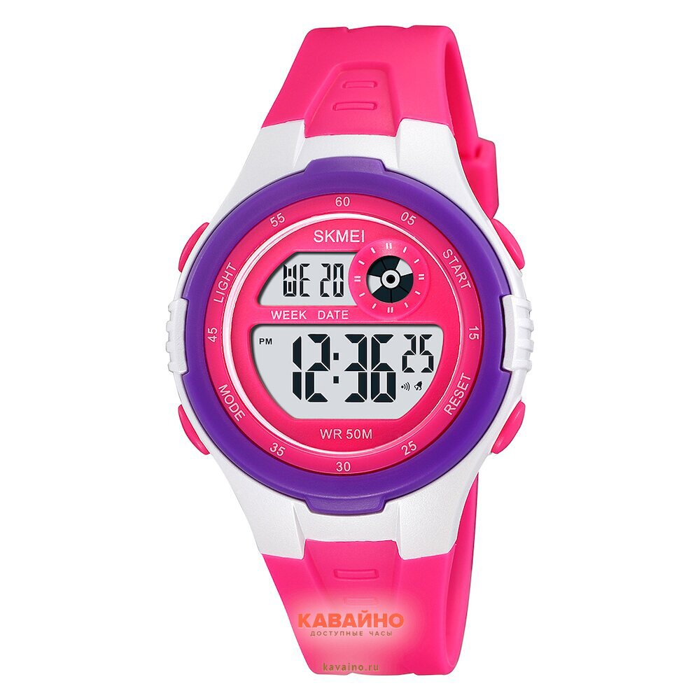 Часы оснащены цифровым отображением времени с яркими арабскими цифрами, что обеспечивает отличную читаемость. Прочная пластиковая конструкция корпуса в белом цвете и мягкий полиуретановый браслет розового оттенка гармонично дополняют друг друга, сочетая стиль и комфорт. Браслет длиной 180 мм и шириной 19 мм идеально облегает запястье, а класс водонепроницаемости 5 Bar гарантирует защиту в разных условиях — будь то дождь или случайная брызга воды.