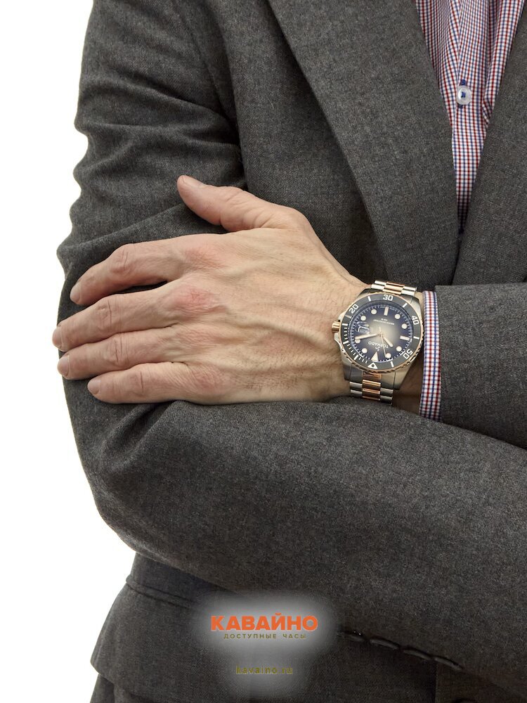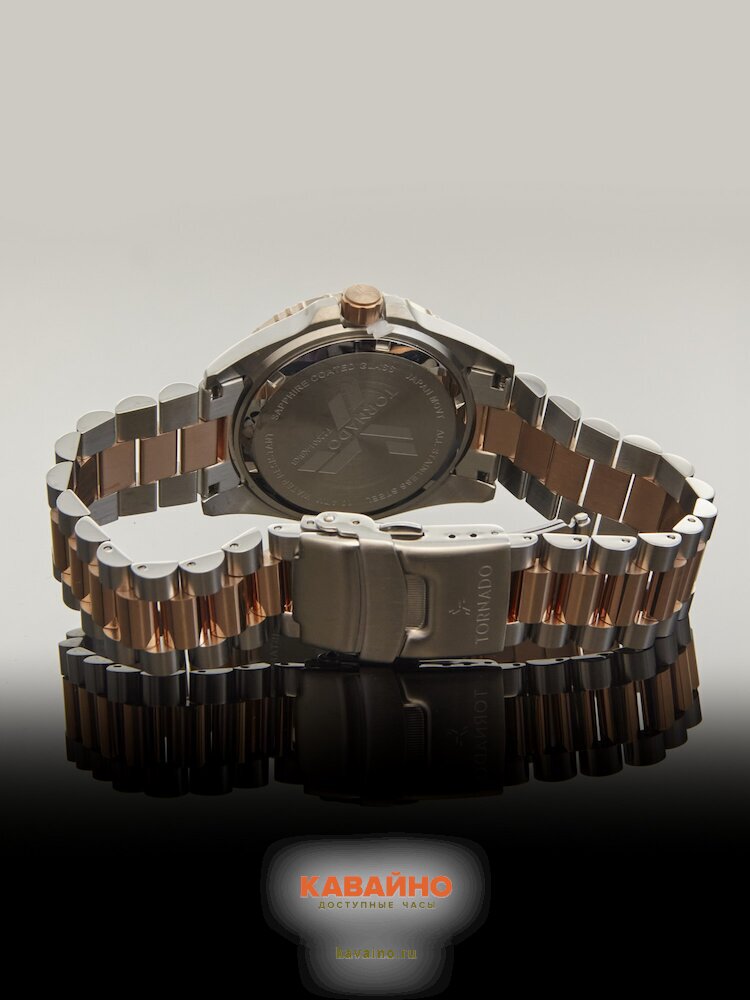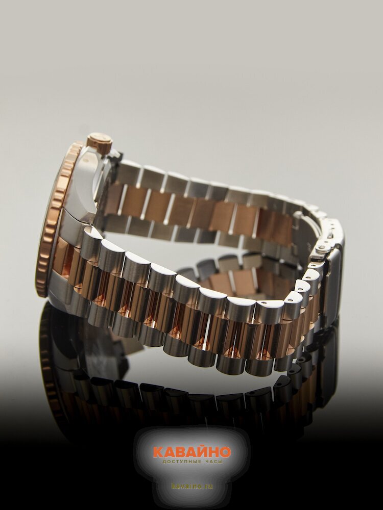 Корпус из нержавеющей стали в серебристом цвете подчеркивает прочность и элегантность, а браслет в розовом золоте добавляет деньку нотку роскоши. Чёрный циферблат с яркими отметками удобно считывается в любых условиях, а минеральное стекло с сапфировым покрытием защищает его от царапин и повреждений.