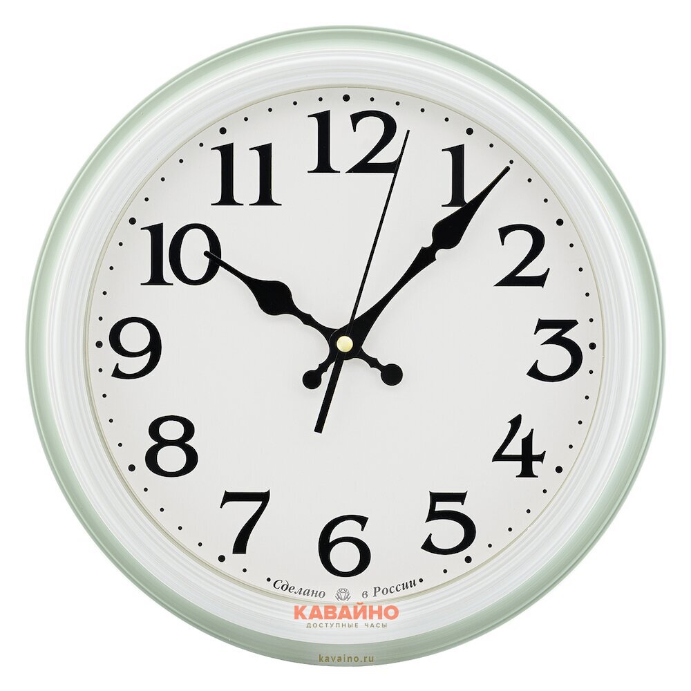 Корпус часов представлен в стильном зеленом цвете, добавляя нотку свежести и уюта. Белый циферблат с контрастными арабскими цифрами обеспечивает отличную видимость времени в любых условиях освещения. Высококачественное минеральное стекло защищает циферблат от повреждений и царапин, а долговечный пластик корпуса гарантирует надежность и легкость ухода.
