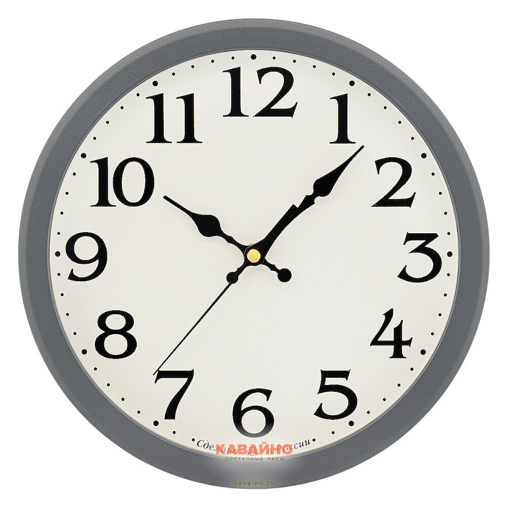 Часы имеют круглая форму и выполнены в сдержанном сером оттенке, что делает их универсальными и легко вписывающимися в любой интерьер — будь то кухня, гостиная, спальня или коридор. Белый циферблат с арабскими цифрами обеспечивает отличную читаемость, а плавный ход кварцевого механизма гарантирует точность во времени.