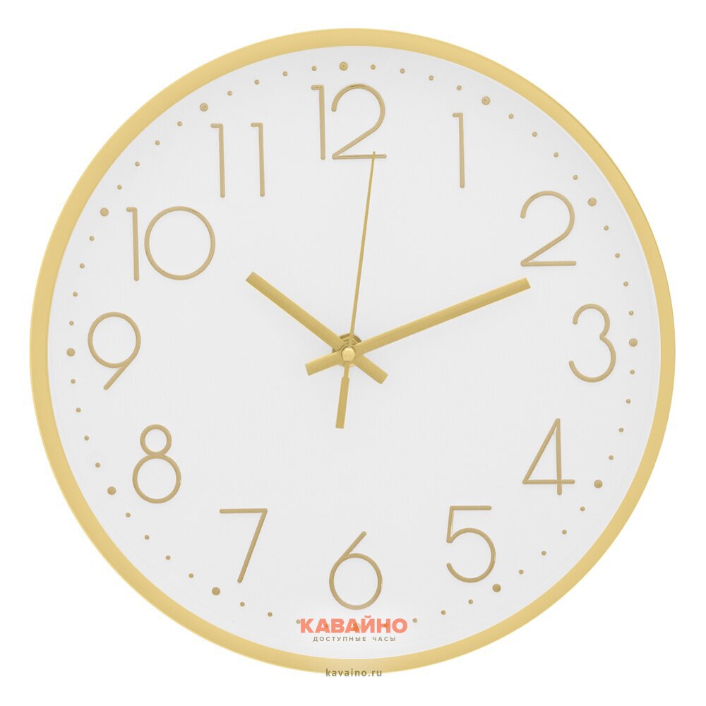 Корпус часов выполнен из качественного пластика золотистого цвета, что придает им изысканный вид и долговечность. Белый циферблат с арабскими цифрами обеспечивает легкость считывания времени, а плавный ход кварцевого механизма гарантирует точность в каждую минуту.