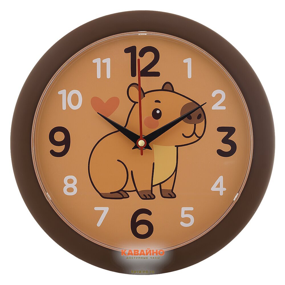 Часы выполнены в круглом формате, с коричневым корпусом из качественного пластика, что делает их легкими и долговечными. Яркий оранжевый циферблат привлекает внимание и создает атмосферу тепла и уюта. Арабские цифры на циферблате обеспечивают легкость и удобство считывания времени, что особенно актуально для детской комнаты, где важно, чтобы часы были понятны и доступны.