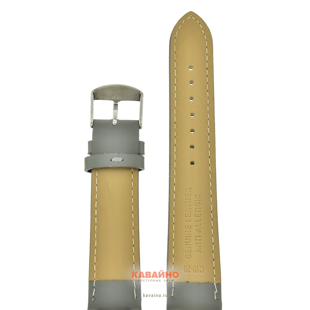 Ремешок выполнен из натуральной кожи, что обеспечивает не только приятные тактильные ощущения, но и долговечность. Ширина ремешка составляет 20 мм, что делает его универсальным вариантом для множества моделей часов. Серый цвет придаёт ему мужественность и универсальность, позволяя сочетать ремешок как с повседневной, так и с деловой одеждой.